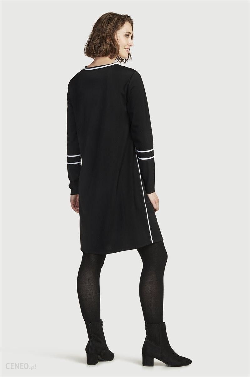 Sukienka dla zrelaksowanego, dobrze dopasowanego wyglądu. Fason z elastycznego dżerseju żakardowego z dopasowanym prostym krojem, okrągłym dekoltem, długimi rękawami i detalami w kontrastowych kolorach. Długość od ramion ztyłu wzależności od rozmiaru ok. 93-100 cm.