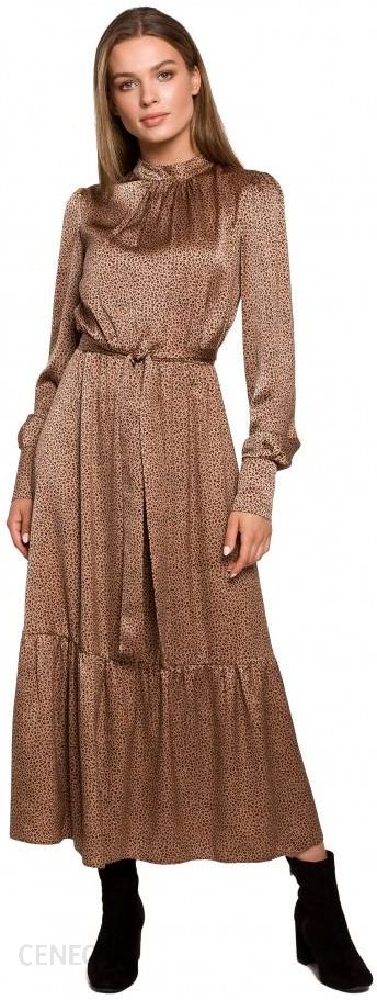 Maxi sukienka z falbaną -brązowa. Długa sukienka wykonana z połyskującej tkaniny w lamparci wzór. Rękawy długie, zakończone mankietem, w pasie gumka oraz wiązany pasek, dół sukienki wykończony falbaną. Sukienkę założysz zarówno do pracy, jak i na specjalne okazje.Modelka ma 174 cm wzrostu i nosi rozmiar SMateriał: poliester 100%